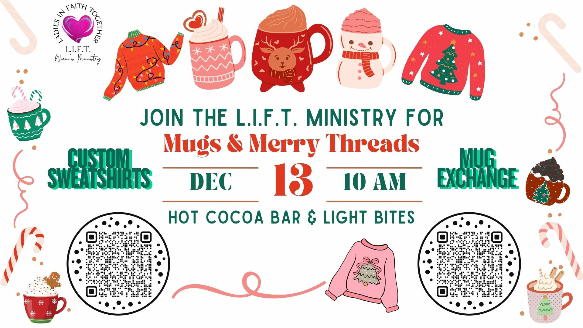 This will be a Christmas fellowship for the women of our church. We will host a hot cocoa bar and light bites. Guests will be invited to participate in a mug exchange, as well as bring their own sweatshirt/tshirt for holiday shirt decorating!